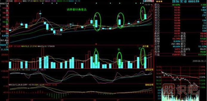 技術(shù)特征:試盤量經(jīng)典量態(tài),試盤量發(fā)生在兩個(gè)位置,一處為循環(huán)低位區(qū),股價(jià)為準(zhǔn)備上漲前的暖身運(yùn)動(dòng),稱為低位試盤量;另一處發(fā)生在股價(jià)漲升一段時(shí)間之后,股價(jià)處于高位整理軋尚未明顯走弱,呈現(xiàn)成交量能逐漸增加現(xiàn)象,稱為高位試單量。試盤量發(fā)生之后往往伴隨攻擊型量能的啟動(dòng)。正如:小荷才露尖尖角的試盤量發(fā)生后,隨后攻擊量的到來,必將催生股價(jià)映日荷花別樣紅。下面討論低位試盤量。發(fā)生在2次試盤量之后常為變盤點(diǎn)。試盤量如下圖國(guó)際實(shí)業(yè)(000159)標(biāo)示A、B、C處。