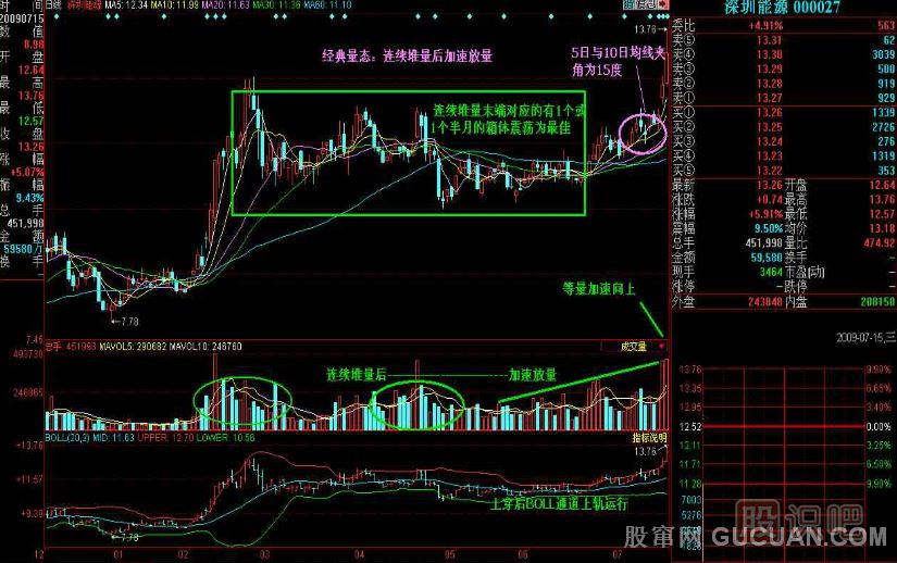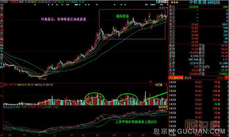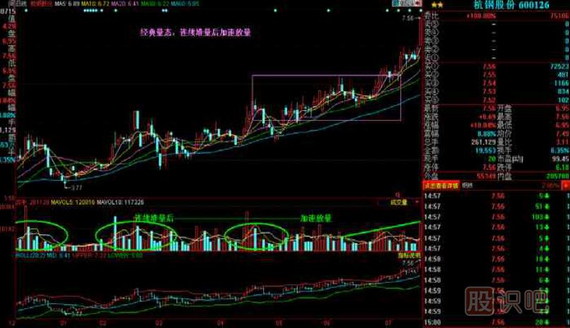 技術(shù)特征:長江后浪推前浪一連續(xù)堆量后加速放量的經(jīng)典量態(tài):前期股價箱體震蕩,成交量呈階段性堆量,堆量的末端,成交量連續(xù)放量,推動股價節(jié)節(jié)走高。階段性堆量過程就大海遠遠的一波一波的浪的波動;連續(xù)放量,就像己推行到岸邊巖石上的前浪,加速磅礴向上。前期階段性的堆量過程,是主力機構(gòu)有計劃、有意識做盤留下的痕跡,它一般是中長線主力的試探性建倉行為,也可能是短線主力搜集籌碼的所致,這時對應(yīng)K線多呈箱體震蕩形態(tài);一旦建倉完畢,隨后加速放量,推動股價爆發(fā)一波上升浪。