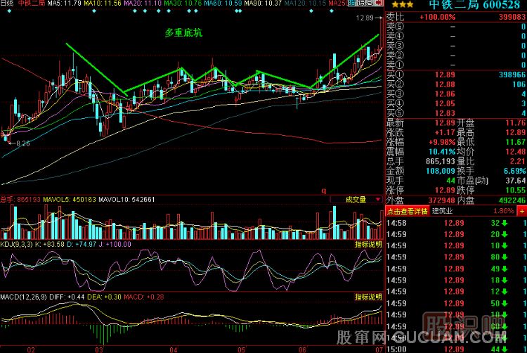 出擊買點(diǎn):總的來看,強(qiáng)弱有下淺平的坑比深陡的坑強(qiáng);未擊穿有重要均線或如下軌線等關(guān)鍵支撐位的坑比6位的坑強(qiáng);率先趕底的比的后見底的底強(qiáng);下跌筑底時(shí)縮量比放量的強(qiáng);整體來看,不破重要支撐線、平淺和縮量的坑孕育較大的上漲機(jī)會(huì)。經(jīng)典的出坑方式有:頭肩底式、W底式、多重底式、U形底式、V形底式、小連陽出坑方式,等等。這些是出坑方式的常規(guī)武器。本節(jié)介紹三重底、多重底和復(fù)合底型坑的運(yùn)用。