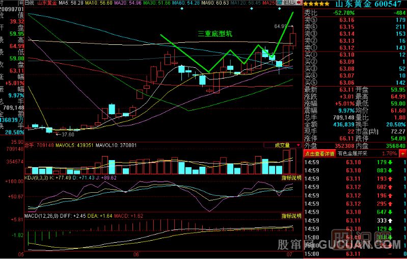 技術(shù)分析:三重底坑是多重底坑的一種,也為常見的經(jīng)典出坑方式。股價(jià)在爬出坑底的時(shí)候,要面臨上方層層套牢盤打壓,莊家通過三大陽拉高一小陰回抽”的振蕩底手法來把高位的套牢盤磨到底部來,形成三重底坑,化解壓力。出擊點(diǎn):每次回抽點(diǎn)位。