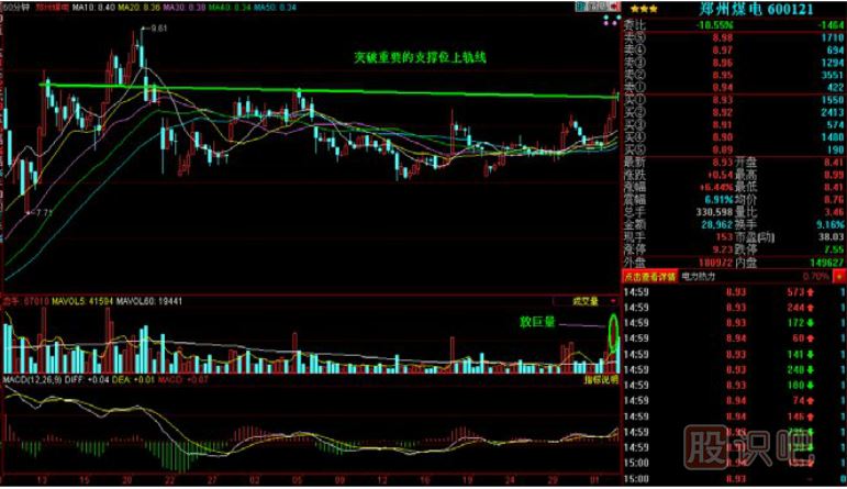 4、60分鐘K線明顯帶巨量上漲并突破重要技術(shù)位,增加有效性;突破型K線換手率達(dá)3%以上,換手越大越好。