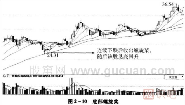 當股價經(jīng)過一段時間的下跌之后,出現(xiàn)螺旋槳K線,意味著股價很可能即將見底,這是一個看漲的信號,投資者遇到這樣的K線可以適當買入,待漲勢形成,就可以繼續(xù)追加投入。如圖2-10所示