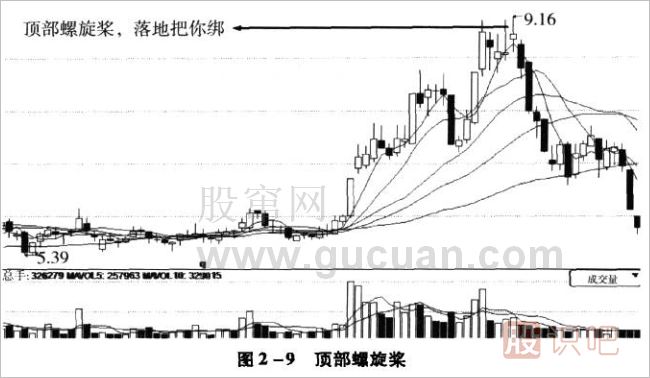 正因為螺旋槳體現(xiàn)出多空雙方的爭奪,表明市場不傾向于某一方,一旦這樣的K線出現(xiàn),往往預示著盤面即將發(fā)生變化。如果市場一直處于多頭行情之中,螺旋槳出現(xiàn)后很可能會變盤,使得股價由漲轉(zhuǎn)跌,因此就有“頂部螺旋槳,落地把你綁”的說法。如圖2-9所示。