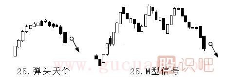 所謂M字型(或稱倒W型)系指行情出現(xiàn)第一次天價(jià)后,開始回跌,當(dāng)?shù)诙蜗蛱靸r(jià)挑戰(zhàn)時(shí),卻因大量賣盤涌現(xiàn),無(wú)法突破第一次天價(jià)價(jià)位,在第一次天價(jià)價(jià)位附近形成第二次天價(jià),然后下跌。這種形態(tài)類似英文字母“M”,故稱“M字型”。這是明顯的賣出信號(hào)
