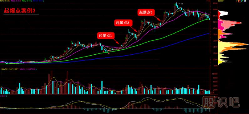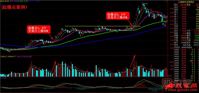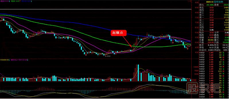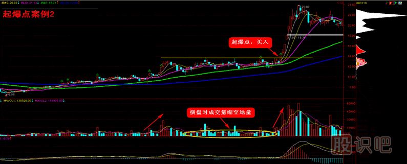 根據(jù)起爆點所處位置的不同,可以分為陽起爆和陰起爆。所謂陽起爆就是在中長線趨勢向上的上漲過程中,回調(diào)結(jié)束再次上漲時所產(chǎn)生的起爆點,往往可靠性較高,且起爆后漲幅較大;而陰起爆則是在中長線趨勢向下的過程中,由于超跌反彈所產(chǎn)生的起爆點,往往可靠性低,且起爆后漲幅也不大。本系列所講的起爆點均為超級黑馬起爆點,即陽起爆。