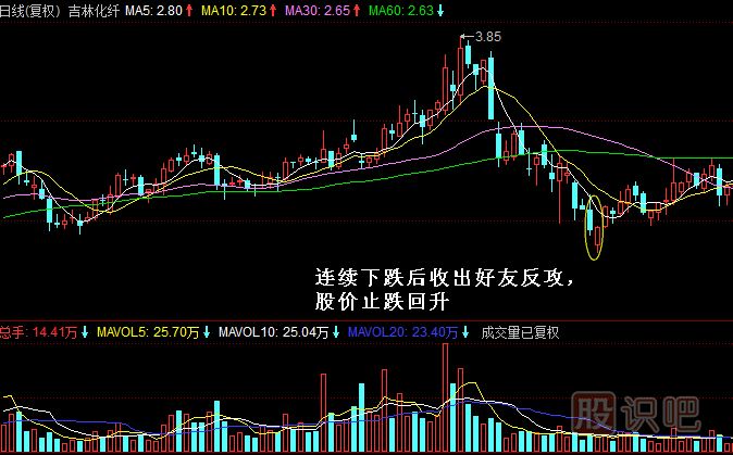 好友反攻K線組合一般出現(xiàn)在股價(jià)大幅下跌之后,一般是股價(jià)即將見底的信號(hào)。股價(jià)經(jīng)過大陰線的殺跌,再經(jīng)過陽線的大幅低開,短期內(nèi)將股價(jià)殺跌動(dòng)能消耗掉,因此多頭組織反攻的概率極大。好友反攻與晨光乍現(xiàn)的區(qū)別在于,好友反攻的陽線實(shí)體主要在陰線的下方,并未深入陰線,因此見底信號(hào)稍弱于晨光乍現(xiàn)。但好友反攻明顯預(yù)示著股價(jià)短期內(nèi)繼續(xù)殺跌的力量減弱,投資者不應(yīng)急于割肉而應(yīng)等待股價(jià)反彈,輕倉持有者則可以適當(dāng)搶短線買入。