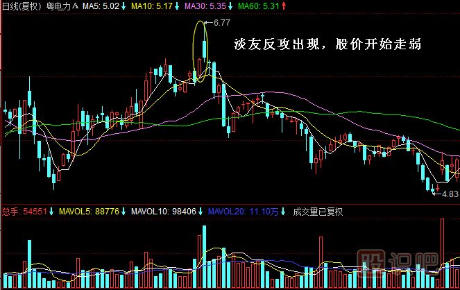 實(shí)例2:2009年11月19日,粵電力A(000539)在經(jīng)過震蕩上漲之后收出了一個(gè)放量的大陽線。由于成交量快速放大,加之收出大陽線,投資者以看好居多,第二天股價(jià)順勢(shì)大幅高開,并且盤中再次大幅拉高,追入者甚,但股價(jià)短暫拉高之后便出現(xiàn)了逐波跳水的走勢(shì),收盤又回到了前一個(gè)交易日陽線的收盤價(jià)附近,此時(shí)形成的就是高位淡友反攻。該股便在此處形成了一個(gè)中期頂部,之后股價(jià)開始走弱。如圖所示。