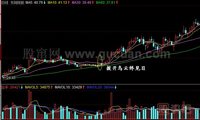 首先我們來看一下,這組K線并不是在股價連續(xù)上漲之后出現(xiàn)的,而是在充分調整了一段時間之后才出現(xiàn),而且陽線成交量明顯放大,第二天的陰線成交量卻嚴重縮小。如果股價沒有經(jīng)過大幅拉升,說明莊家沒有出貨的動機,同時成交沒有明顯放大,說明莊家沒有出貨的行為。那么這樣的烏云蓋頂或許就只是暫時的,我們不應該急于作出投資決定,而應該觀察接下來的走勢。事實也正是如此,該股在接下來的幾個交易日中放量走強,站上了多條均線,這就是撥開烏云終見日。