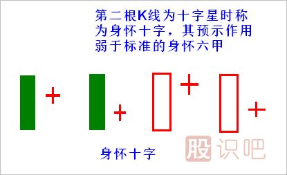 4.身懷六甲K線組合第二根K線為十字星時(shí)變異為身懷十字,力度減弱,在趨勢形成初期一般不會(huì)改變原有趨勢。