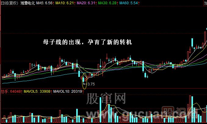 實(shí)例1:2009年8月4日,湘潭電化(002125)在經(jīng)過半個(gè)月的連續(xù)下跌之后,收出了身懷六甲的K線圖形。8月19日,該股大幅殺跌,最低至9.65元,次日高開高收,全天股價(jià)運(yùn)行范圍都在前一天的K線實(shí)體之內(nèi),此時(shí)這對母子線就孕育了新的轉(zhuǎn)機(jī),投資者可以克服恐懼,買入該股,之后該股果然見底回升,如圖所示。