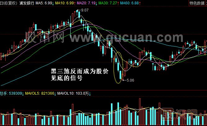 如果每天陰線都是高開(kāi)低走,就是最標(biāo)準(zhǔn)的三只烏鴉。但如果三只烏鴉出現(xiàn)的都是低開(kāi)低走的大陰線,并且K線的實(shí)體非常大,顯示空方氣焰非常囂張,筆者稱之為“黑三煞”。如果黑三煞出現(xiàn)在高位,則同樣是后市中期看跌的標(biāo)志,但如果這樣的K線出現(xiàn)在大幅下跌之后,則很可能是短期即將見(jiàn)底的轉(zhuǎn)勢(shì)信號(hào)。因?yàn)榭辗竭B續(xù)大幅殺跌充分釋放了做空的動(dòng)力,股價(jià)很可能會(huì)探出短期底部,投資者需要加以區(qū)分。