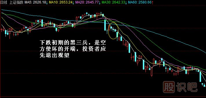前一節(jié)講的紅三兵,有紅三兵就有黑三兵。當(dāng)三只烏鴉的K線實(shí)體較小時(shí),就如同三個(gè)身穿黑色衣服的小兵,也是下跌的信號(hào),但預(yù)示的強(qiáng)度不如三只烏鴉,如果出現(xiàn)在高位,投資者可先退出觀望,經(jīng)過(guò)短期調(diào)整之后,再作新的投資決定。