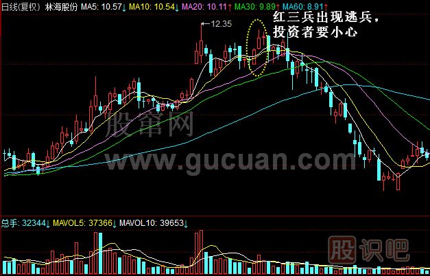 如果紅三兵的第三根陽線突然變得實體很小,則可稱為出現(xiàn)了逃兵,雖然前面兩根陽線代表多頭繼續(xù)進攻的意愿,但第三根K線表明做多的力量已經(jīng)跟不上,股價隨時可能出現(xiàn)回落,特別是在漲升一程之后,此時投資者要考慮先賣出。