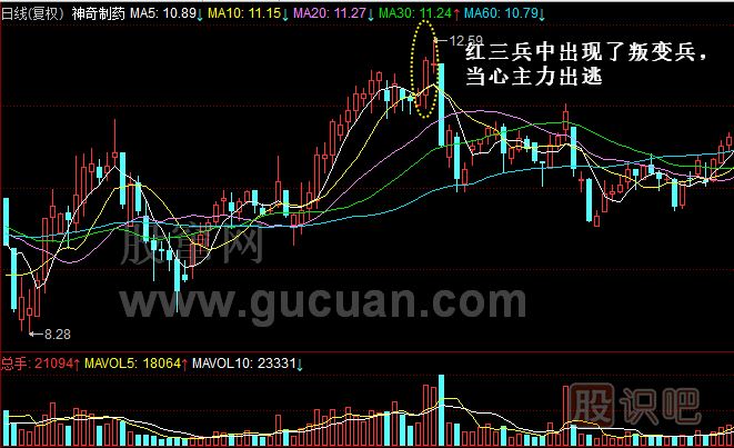 變兵,是指第三根K線收出了很長的上影線,顯示出多方壓力特別沉重,投資者瞬間從多方轉入空方隊伍,往往會使整個紅三兵看漲的技術含義失效,因此筆者稱之為叛變兵。