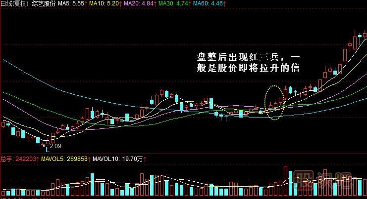因此紅三兵出現(xiàn)之后,股價往往會繼續(xù)上漲,而且往往出現(xiàn)放量上漲,原因是有更多主力加入,股價得到新的上漲動力,是買入的信號。