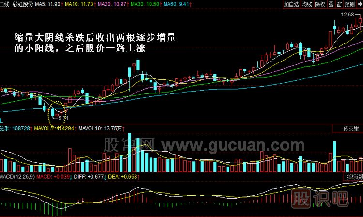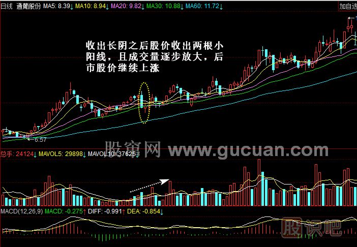 案例1:2007年2月27日,通葡股份(600365)在經(jīng)過一段時間的緩慢攀升之后收出一根很嚇人的大陰線,很多散戶投資者戰(zhàn)戰(zhàn)兢兢地選擇了賣出,但該股在緊接著的兩個交易日卻收出了兩根小陽線,成交量一天比一天大,之后股價止跌,繼而一路攀升。因此,在出現(xiàn)大陰線時賣出的投資者就踏空了該股之后很大的一段主升浪行情,如圖所示。