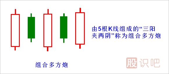 多方炮,即多方準(zhǔn)備“開炮”,一般出現(xiàn)這種K線圖形,股價后市上漲的概率極大,是短線較好的介入點。有時候,這種形態(tài)會變異成“三陽夾兩陰”,這是組合多方炮,如圖2所示。