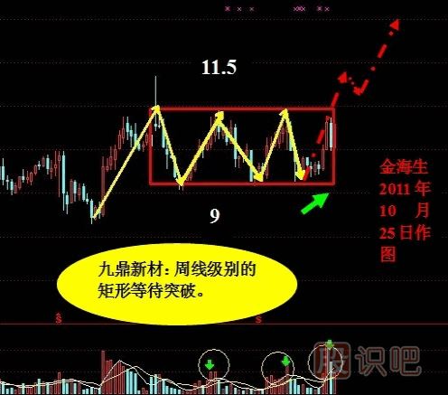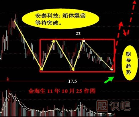 2、在相對高/低位容易形成反轉,所以一定要注意。主要是看量能,如果高位運動到下限位置放量向下突破,則演變成頂部,如果低位運動到上限位置放量向上突破則演變成底部。