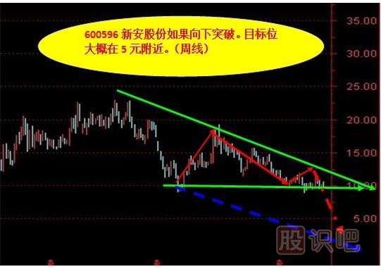600596 新安股份周線級別的下降三角形。目前還不能判定它是處于底部還是頂部。因為這個股票和特殊,莊家