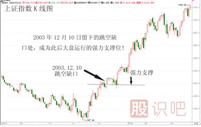 如2003年12月10日大盤留下一個跳空缺口,其后,近兩周的時間,每次打到缺口附近,指數(shù)都被拉起,直到一根大陽線,拔地而起,一輪加速上揚(yáng)行情展開。(見下圖)