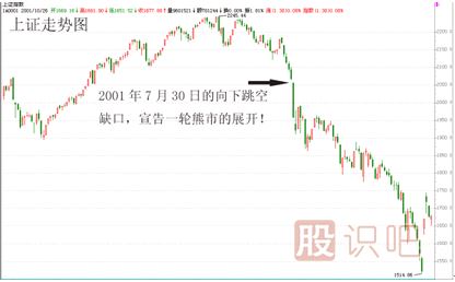 例如:2001年7月30日,大盤以2056點(diǎn)跳空9點(diǎn)低開,并且留下一根實(shí)體達(dá)100多點(diǎn)的大陰線,宣告一輪大熊市的展開。(見下圖)