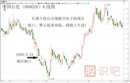再如:600028中國石化,從2004年1月7日開始,大幅調(diào)整,一路陰跌,中間并無缺口,但在2005年5月24日跳空低開,留下一個缺口,象這種長期下跌后再向下的缺口,就是一個竭盡缺口,此后中國石化,再經(jīng)過一段下跌后,在2005年6月6日找到底部,從此邁上漫漫牛途!(見下圖)