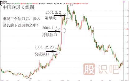 例如:中國聯(lián)通600050,在2003年底2004年初的一輪行情之中,2003年12月23日以2.90元開盤,留下突破缺口,2004年1月6日以3.32開盤留下持續(xù)缺口,我們知道,其高點(diǎn)應(yīng)在3.74元附近,這只是一個估算,但當(dāng)中國聯(lián)通在2004年2月2日再次跳空高開,留下竭盡缺口之時,說明此輪行情已經(jīng)結(jié)束。此后,中國聯(lián)通調(diào)整長達(dá)2年之久。(見下圖)