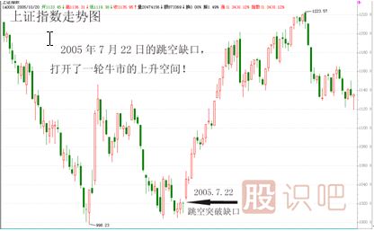 例如,2005年7月22日,上證指數(shù)以1026點(diǎn)跳空高開,并且當(dāng)天大漲2.52%,迅速脫離1000點(diǎn)這個“危險”的整數(shù)關(guān)口,其后一輪轟轟烈烈的大牛市就此展開。如圖: