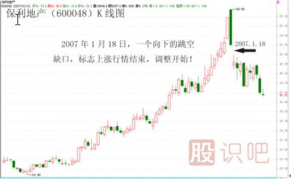 再如600048保利地產(chǎn),在2007年1月18日留下了一個向下的突破缺口,標(biāo)志著一輪調(diào)整行情的開始。(見下圖)
