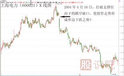 再如,上海電力(600021)這只個股在2003年10月29日上市后,一路震蕩上揚(yáng),走勢極為穩(wěn)健,但在2004年4月16日這天,突然間大幅跳空低開,留下了一個向下的突破缺口,使前期連續(xù)五個交易日的7.80元附近的支撐位立刻變成阻力位,而在7.80元附近買進(jìn)的投資者根本來不及反應(yīng),便已被深套。此后,該股股價一路單邊下跌,一直到跌破上市當(dāng)天的最低價。(見下圖)