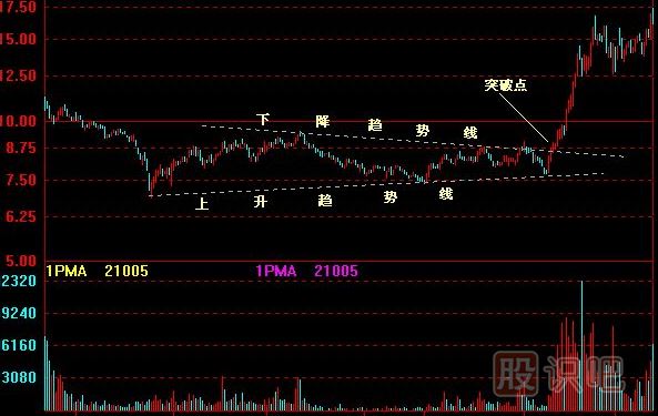 一般情形之下,對稱三角形是屬于整理型態(tài),即股價會繼續(xù)原來的趨勢移動。只有在股價朝期中一方明顯突破后,才可以采取相應(yīng)的買賣行動。如果股價往上沖破阻力(必須得到大成交量的配合),就是一個短期買入訊號;反之若是往下跌破(在低成交量之下跌破),便是一個短期沽出訊號。