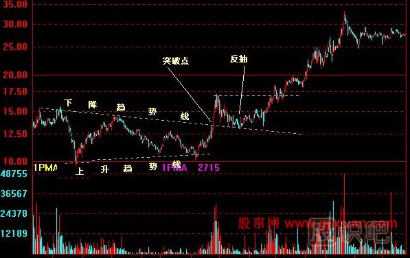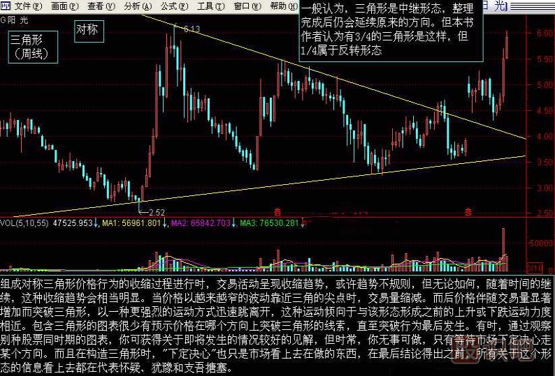 (5)對稱三角形突破后,可能會出現(xiàn)短暫的反方向移動(反抽),上升的后抽止于高點相連而成的型態(tài)線,下跌的后抽則受阻于低點相連的型態(tài)線之下,倘若股價的后抽大于上述所說的位置,型態(tài)的突破的可能有誤。