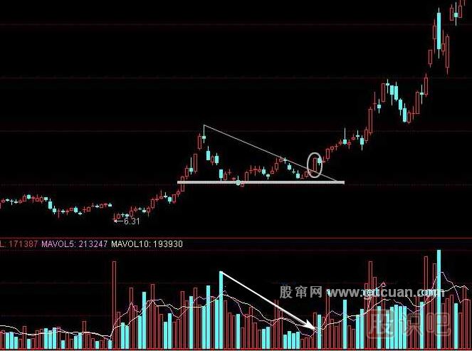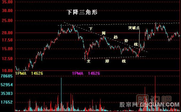 (2)上升三角形在突破頂部水平的阻力線(xiàn)時(shí),有一個(gè)短期買(mǎi)入訊號(hào),下降三角形在突破下部水平阻力線(xiàn)時(shí)有一個(gè)短期沽出訊號(hào)。但上升三角形在突破時(shí)須伴有大成交量,而下降三角表突破時(shí)不必有大成交量來(lái)證實(shí)。