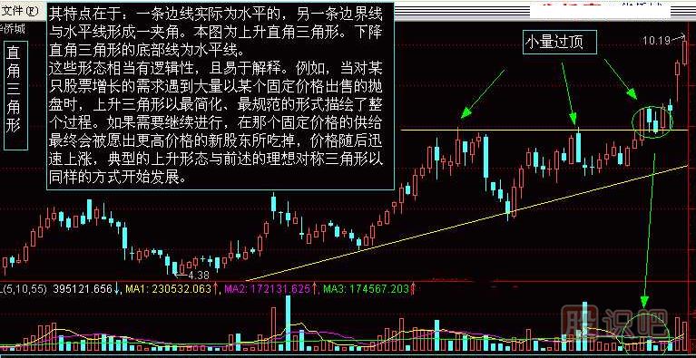 上升三角形顯示買(mǎi)賣(mài)雙方在該范圍內(nèi)的較量,但買(mǎi)方的力量在爭(zhēng)持中已稍占上風(fēng)。賣(mài)方在其特定的股價(jià)水平不斷沽售不急于出貨,但卻不看好后市,于是股價(jià)每升到理想的沽售水平便即沽出,這樣在同一價(jià)格的沽售形成了一條水平的供給線(xiàn)。不過(guò),市場(chǎng)的購(gòu)買(mǎi)力量很強(qiáng),他們不待股價(jià)回落到上次的低點(diǎn),更急不及待地購(gòu)進(jìn),因此形成一條向右上方傾斜的需求線(xiàn)。另外,也可能是有計(jì)劃的市場(chǎng)行為,部分人士有意把股價(jià)暫時(shí)壓低,以達(dá)到逢低大量吸納之目的。