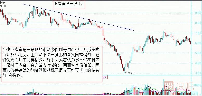下降三角形的形狀的上升三角形恰好相反,股價(jià)在某特定的水平出現(xiàn)穩(wěn)定的購(gòu)買(mǎi)力,因此介每回落至該水平便告回升,形成一條水平的需求線(xiàn)??墒鞘袌?chǎng)的沽售力量卻不斷加強(qiáng),股價(jià)每一次波動(dòng)的高點(diǎn)都較前次為低,于是形成一條下傾斜的供給線(xiàn)。成交量在完成整個(gè)型態(tài)的過(guò)程中,一直是十分低沉。