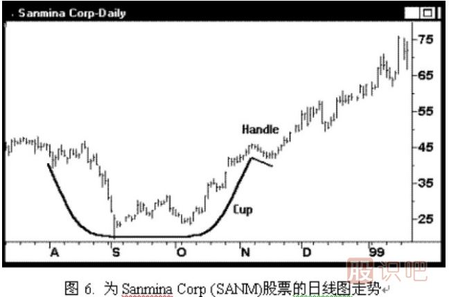 例圖6. 為Sanmina Corp (SANM)股票的日線圖走勢(shì),科技股經(jīng)常成為上佳的“杯與杯把”形態(tài)的候選品種,原因是投資者總是更樂于追捧這類股票