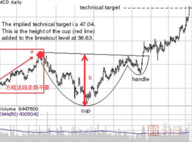 與此相關(guān)的是,杯的深度也是具有爭(zhēng)議性的,我們通常認(rèn)為,一個(gè)標(biāo)準(zhǔn)杯的底部至少要比杯的左半部分高點(diǎn)要低20%,但不應(yīng)超過40%,例如,若杯的左半部分高點(diǎn)為100元的話,則杯的底部應(yīng)當(dāng)處于60元(低20%)至80美(低40%)之間。