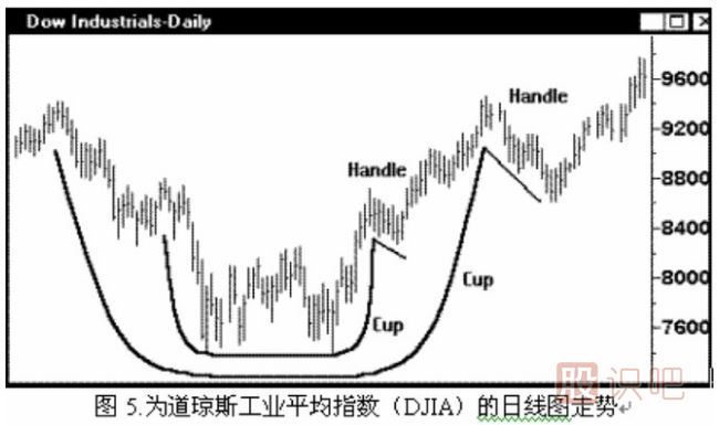 例圖5.為道瓊斯工業(yè)平均指數(shù)Dow Jones Industrial Average (DJIA)的日線圖走勢(shì),注意其中較小的“杯與杯把”形態(tài)實(shí)際上只是另一個(gè)更大的“杯與杯把”形態(tài)的組成部分而已。