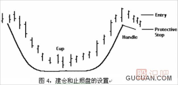 例圖4,所顯示的是建倉(cāng)和止損盤的設(shè)置,當(dāng)股價(jià)突破當(dāng)前的高點(diǎn)后才建倉(cāng),這時(shí)該股票已經(jīng)重納升軌,此時(shí)建倉(cāng)實(shí)為順?biāo)浦?,假如股價(jià)跌破杯把的低點(diǎn)將宣告這一形態(tài)失效,此時(shí)在貼近杯把底部的下放設(shè)置止損盤可以將損失降至最低。