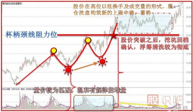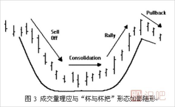 在杯的右半部分形成階段,一旦出現(xiàn)向上突破的走勢(shì),成交量又會(huì)再度出現(xiàn)增長(zhǎng)的勢(shì)頭,為持續(xù)的上升提供能量,最后,在杯把形成階段股價(jià)出現(xiàn)獲利回吐時(shí),成交量開始出現(xiàn)萎縮,在這一階段若出現(xiàn)巨大的成交量,就要警惕這決不僅僅是一般意義上的獲利回吐了,而是有可能出現(xiàn)新一輪的下跌。