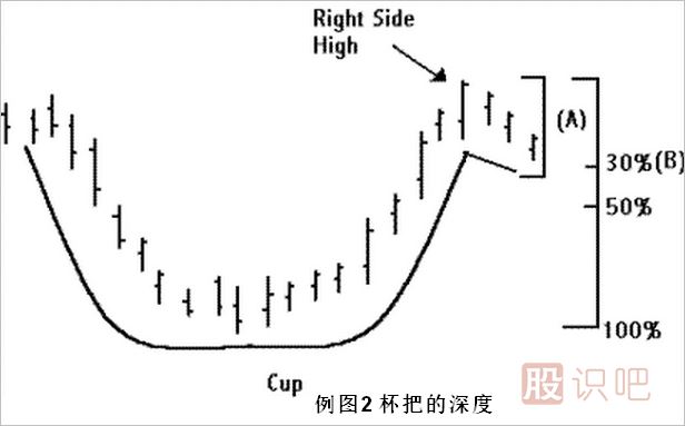 例圖2.顯示的是杯把的深度,理想的模式為,(A)點(diǎn)所對(duì)應(yīng)的杯把部分所回抽的深度不應(yīng)超過該股當(dāng)前高點(diǎn)的5 ~ 15%或不超過杯底以來升幅的30%,跌幅過大的杯把將破壞這一形態(tài),甚至有可能演變成新一輪的下跌趨勢(shì)。