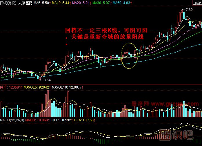 有時(shí)候回檔不一定是三根陰線,也可能是陰陽(yáng)互摻,但本質(zhì)是一樣的,中途的多根短K線的作用也是回檔,清洗掉又一批散戶,然后再繼續(xù)拔高。為什么主力老洗盤,老是想散戶拋籌碼?要知道,主力賺錢都是建立再散戶不賺錢的基礎(chǔ)上的。只有在主力想走人的時(shí)候,才是真心地希望大量散戶買入的時(shí)候。