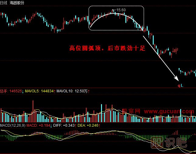 案例1:如圖所示,海越股份(600387)在2009年4月底連續(xù)收了數(shù)個(gè)漲停板,之后股價(jià)繼續(xù)走強(qiáng)。到2009年11月,該股最高漲至16.7元,較低位啟動(dòng)時(shí)翻了三倍,主力獲利非常豐厚,開(kāi)始想如何出貨。從2009年11月起,該股就在高位反復(fù)震蕩,漲不上去也跌不下來(lái)。2010年3月中旬,該股重新發(fā)起新一輪的上升,但這次的上升非常緩慢,漲至15.6元之后又開(kāi)始緩慢下跌,在高位構(gòu)成一個(gè)像鍋蓋一樣的圓弧頂。此時(shí)如果不逃,很可能就要成為主力鍋中的菜肴了。