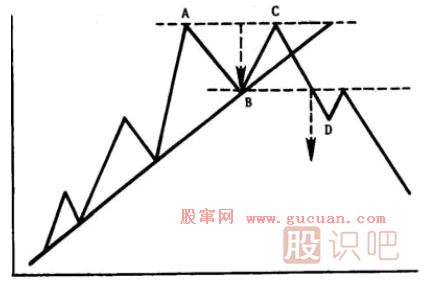 雙頂?shù)睦?。這個(gè)形態(tài)有兩個(gè)大致處于相同價(jià)位的波峰(A和C)。當(dāng)市場(chǎng)按收盤(pán)價(jià)衡量跌破了點(diǎn)B處的波谷時(shí)形態(tài)就完成了。通常,成交量在第二個(gè)波峰(C)萎縮,并在向下突破(D)時(shí)放大。反抽下面一根直線的現(xiàn)象并不少見(jiàn)。最小測(cè)量目標(biāo)是從突破點(diǎn)向下投射出形態(tài)的高度
