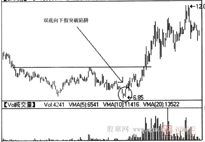 (1)判斷雙底形態(tài)是否有效,投資者要特別關注成交量的配合。一般而言,在第二個波谷形成時,成交量極度萎縮;股價在突破頸線時,應出現(xiàn)成交量成倍放大的情形;在突破頸線后出現(xiàn)的回抽,成交量縮小。