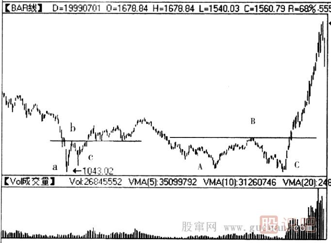 (2)有兩個波谷,最低點基本處于同一水平線上,因酷似英文字母W,又名W底。雙底是底部反轉(zhuǎn)形態(tài)之一,是股價見底回升的信號。投資者見到該種形態(tài),應選擇好買點(一般在股價突破頸線回抽后放量上攻時)適當買進該股等待升勢。走勢圖中的雙底形態(tài)出現(xiàn)在上證指數(shù)的日線圖上,圖中出現(xiàn)兩個雙底的轉(zhuǎn)勢形態(tài)。在前一個較小規(guī)模的雙重底形態(tài)中,先是指數(shù)放量創(chuàng)出1043.02這一近幾年新低,然后又急劇反彈至b點;指數(shù)從b點又開始下跌,成交量有所減少,說明市場殺跌動能已經(jīng)減弱。從圖中我們可以發(fā)現(xiàn),c點明顯高于a點,當市場帶量突破b點時,雙底反轉(zhuǎn)形態(tài)完成。在之后的走勢重,市場極弱,創(chuàng)下一個谷底A,隨后放量上升到B點,從B點開始的下跌甚至跌破了前一谷底A達到C點。此外我們看到在第二個雙底形態(tài)中,第二個波谷要比第一個波谷低,這與通常的情況是相背離的,我們可以用“空頭陷阱”來解釋。此后,股價從C點出發(fā),開始一輪井噴式的上漲行情力,上證指數(shù)創(chuàng)出一波歷史新高。