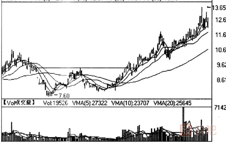 案例2:如圖方框內(nèi)的形態(tài)叫做雙底,雙底是底部反轉(zhuǎn)形態(tài)之一,是股價見底回升的信號,投資者見到雙底形態(tài),應判斷出該股后市看好,可適當介入做多。如圖中的雙底形態(tài)出現(xiàn)后,股價開始一輪較大的上漲行情,從7.60元的低位至13.65元的高價,升幅近80%。
