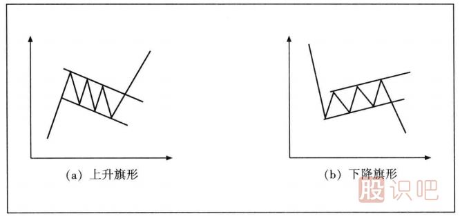 旗形走勢的形態(tài)就像掛在旗桿上的一面小旗,通常出現(xiàn)在快速大幅度的市場波動中,是一種經(jīng)常出現(xiàn)的中段整理形態(tài)。一般來說,旗形又分為上升旗形和下降旗形。其中上升旗形是股價在經(jīng)過陡峭上升之后,進(jìn)入一個稍微向下傾斜的狹窄區(qū)域進(jìn)行整理,上下界限就是兩條向下傾斜的平行直線。而下降旗形是股價在急速下跌之后,進(jìn)入一個稍微向上傾斜的狹窄區(qū)域進(jìn)行整理,其上下界限也是兩條向上傾斜的平行直線。