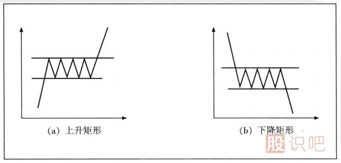 如圖是矩形形態(tài)示意圖,其中左邊是上升矩形走勢圖,右邊是下降矩形走勢圖。需要注意的是,矩形形成過程中,成交量逐漸遞減,向上突破時,需要有大成交量的配合,向下突破則沒有這種需求。此外,股價突破矩形形態(tài)后,其上漲或下跌的幅度至少為矩形本身的寬度。