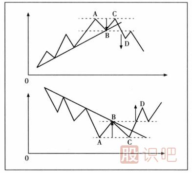 如上圖是對(duì)稱三角形示意圖。一般來(lái)說(shuō),在判別對(duì)稱三角形的形態(tài)時(shí),應(yīng)該注意以下幾個(gè)方面:首先,在對(duì)稱三角形中股價(jià)越接近其頂點(diǎn)而未能突破其界限時(shí),其力量越小,太接近頂點(diǎn)的突破通常會(huì)失效。根據(jù)以往的歷史經(jīng)驗(yàn),突破點(diǎn)應(yīng)該位于距離三角形底邊1/2—2/3處的地方。其次,股價(jià)向上突破三角形時(shí),需要成交量的配合,向下突破則沒(méi)有這個(gè)需求。